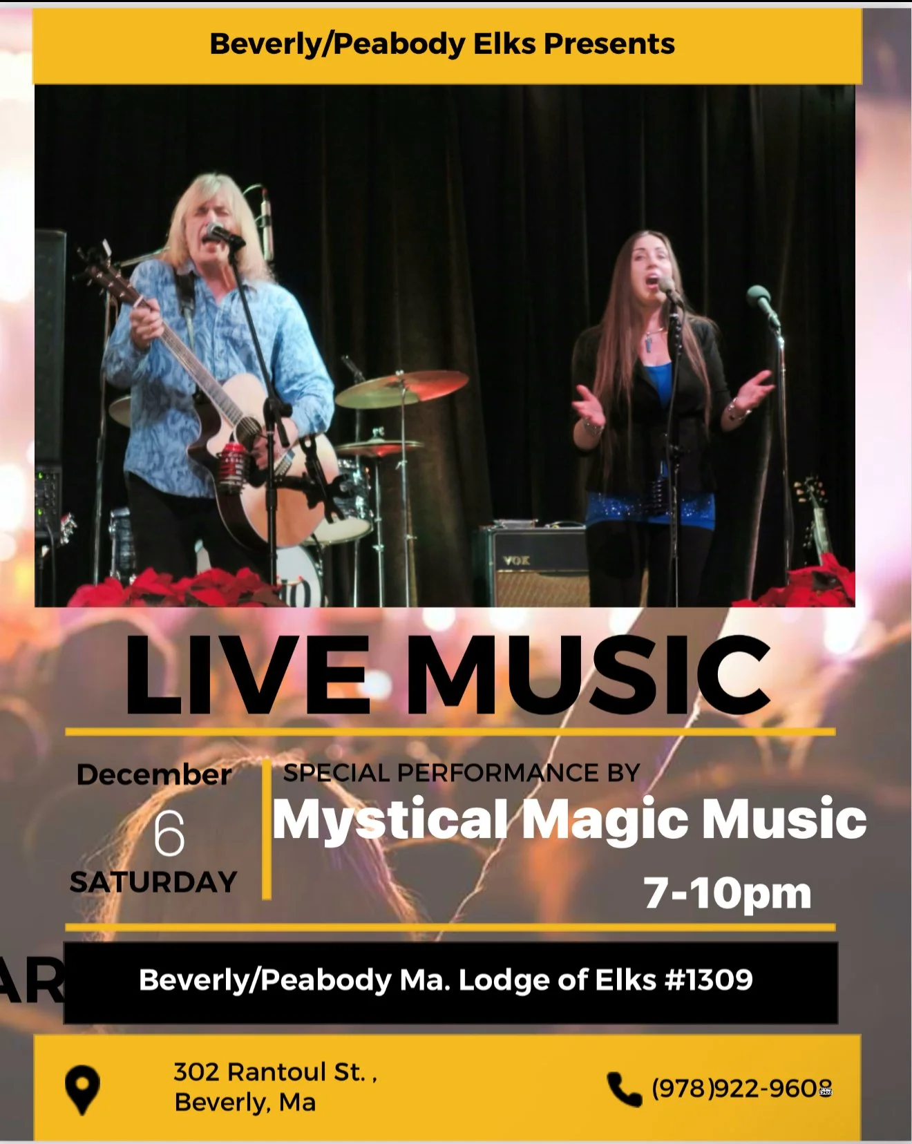 Dec 6 7:00 PM19:00 Mystical Magic Music @ Beverly/Peabody Elks Lodge #1309 Saturday, December 6, 2025 7:00 PM 10:00 PM 19:00 22:00 Beverly/Peabody Elks Lodge #1309 (map) Google Calendar ICS View Event →